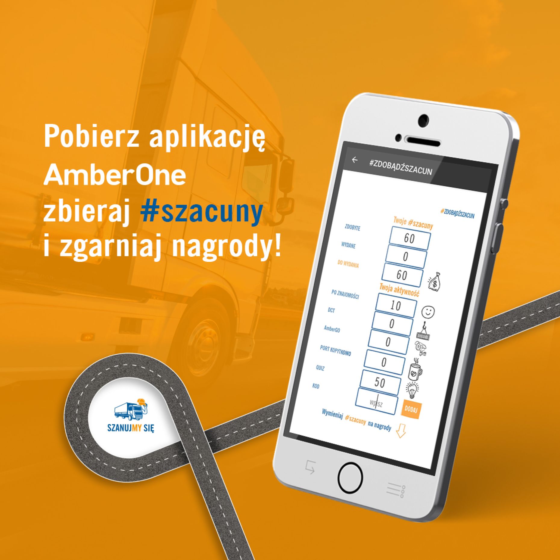 #szacuny to wirtualna waluta, którą zdobywasz za odpowiedzialne zachowania w trasie, np. za bezpieczny przejazd na DCT Gdańsk, za solidny odpoczynek w Porcie Kopytkowo lub za korzystanie z systemu AmberGO. Aplikacja sama zlicza Twoje #szacuny i pokazuje Ci nowe nagrody do odebrania