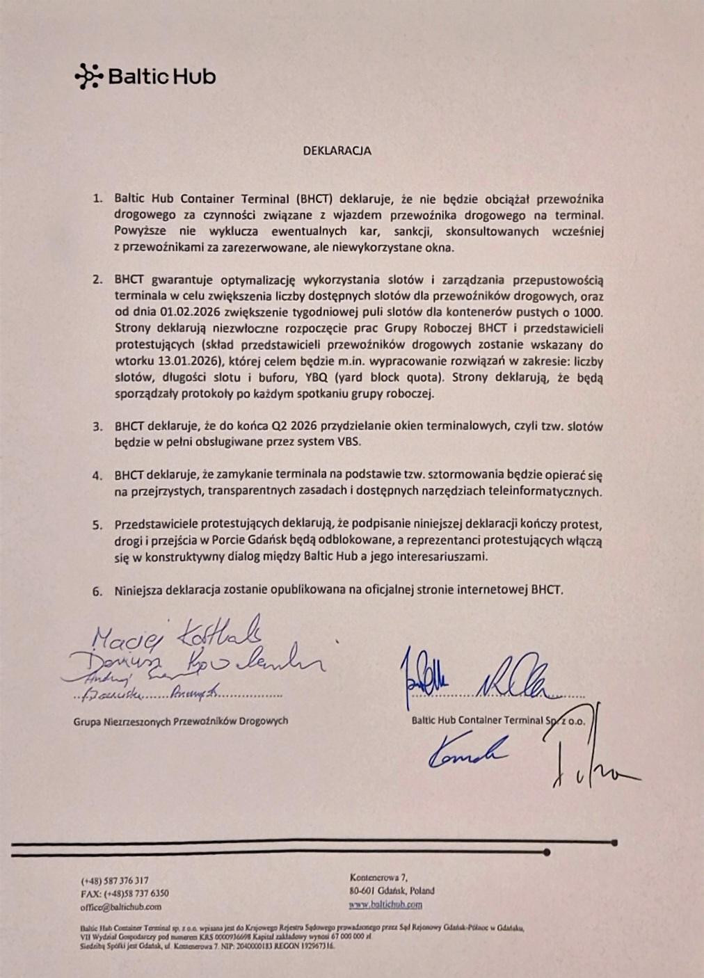 Deklaracja została podpisana przez przedstawicieli przewoźników oraz przedstawicieli Baltic Hub Container Terminal Sp. z o.o., obecnych na spotkaniu.